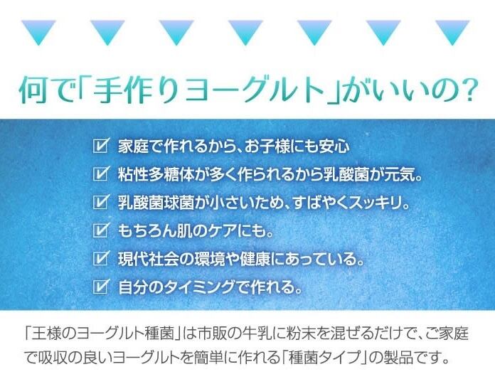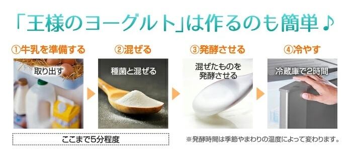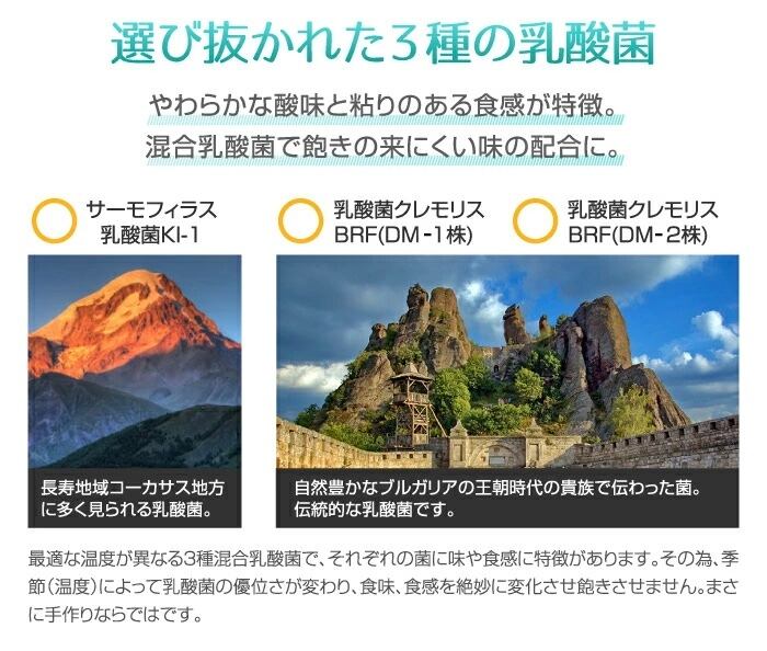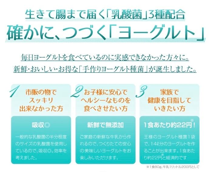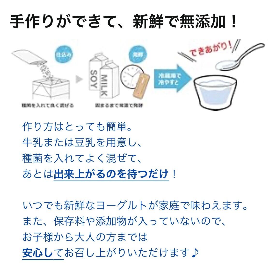 牛乳に混ぜて常温発酵で、もっちりと美味しいヨーグルトのできあがり。生きて腸まで届く3種の乳酸菌を配合。