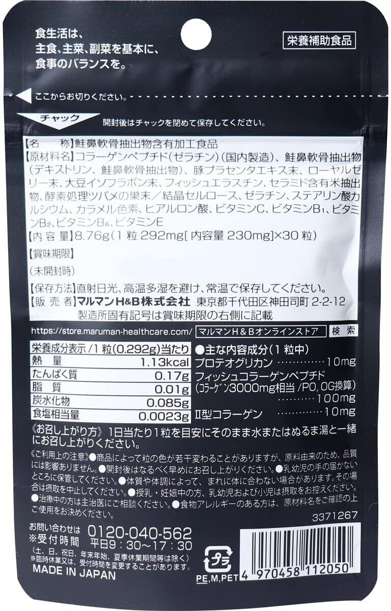 コラーゲンペプチド(ゼラチン)(国内製造)、鮭鼻軟骨抽出物(デキストリン、鮭鼻軟骨抽出物)、豚プラセンタエキス末、ローヤルゼリー末、大豆イソフラボン末、フィッシュエラスチン、セラミド含有米抽出物、酵素処理ツバメの巣末/結晶セルロース、ゼラチン、ステアリン酸カルシウム、カラメル色素、ヒアルロン酸、ビタミンC、ビタミンB1、ビタミンB2、ビタミンB6、ビタミンE