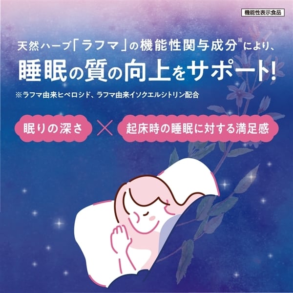 本品にはラフマ由来ヒペロシド、ラフマ由来イソクエルシトリンが含まれます。ラフマ由来ヒペロシド、ラフマ由来イソクエルシトリンには睡眠の質(眠りの深さ・起床時の睡眠に対する満足感)の向上に役立つことが報告されています。