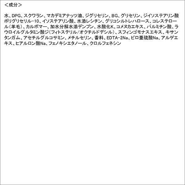 水、DPG、スクワラン、マカデミアナッツ油、ジグリセリン、BG、グリセリン、ジイソステアリン酸ポリグリセリル-10、イソステアリン酸、水添レシチン、グリコシルトレハロース、コレステロール(羊毛)、カルボマー、加水分解水添デンプン、水酸化K、コメヌカエキス、パルミチン酸、ラウロイルグルタミン酸ジ(フィトステリル/オクチルドデシル)、スフィンゴモナスエキス、キサンタンガム、アセチルグルコサミン、メチルセリン、香料、EDTA-2Na、ピロ亜硫酸Na、アルゲエキス、ヒアルロン酸Na、フェノキシエタノール、クロルフェネシン