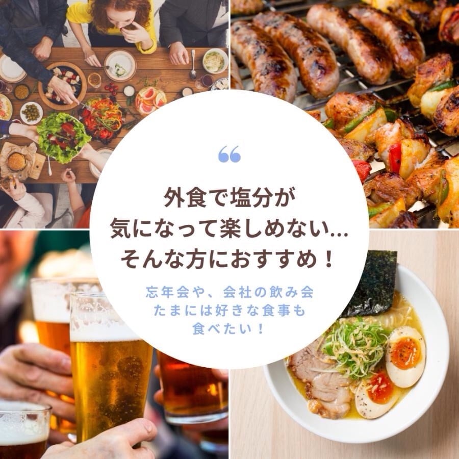 食事の際に3粒を目安にお召し上がりいただくことで、食事中に含まれている余分な塩分(ナトリウム)を吸着し、食事の味を変えずに塩分が気になる方の健康をサポートしてくれます。