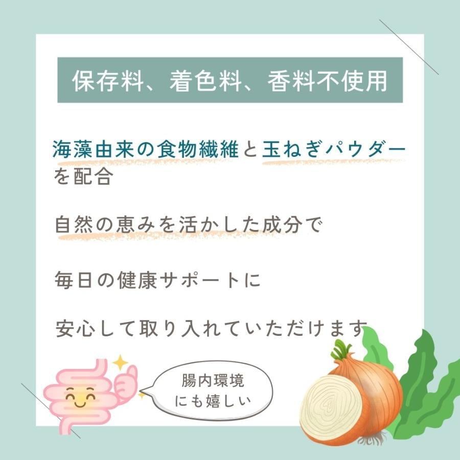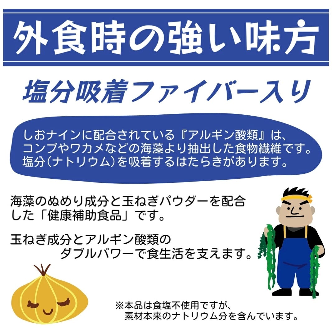 海藻より抽出した食物繊維と、国産無農薬の⽟ねぎを独自製法で乾燥させた⽟ねぎパウダーを配合した減塩サポート食品です。