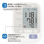正確に血圧を測定するには、カフ(腕帯)を腕にしっかりと巻くことが大切です。「カフぴったり巻きチェック」は、測定のたびに、カフが適切な強さで巻けているかどうかをチェックし、画面でお知らせします。