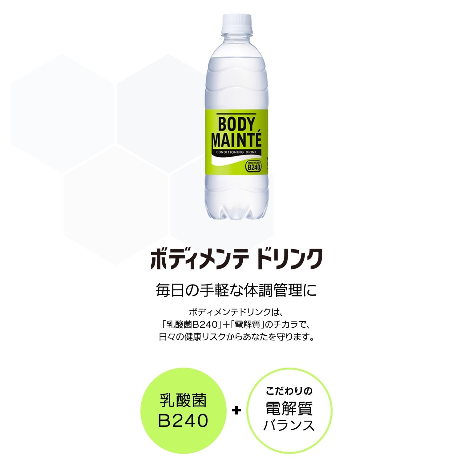●「ボディメンテ ドリンク」は、カラダを守る「乳酸菌B240」と潤いをサポートする「水分・電解質」を組み合わせた飲料として様ーな健康リスクにさらされる日常生活の中で、日ごろから体調管理を心がけるあらゆる人ーのコンディションづくりをサポートします。
