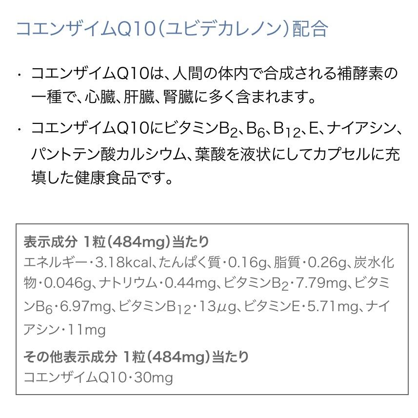 コエンザイムQ10にビタミンB2、B6、B12、E、ナイアシン、パントテン酸カルシウム、葉酸を液状にしてカプセルに充填した健康維持食品です。