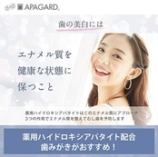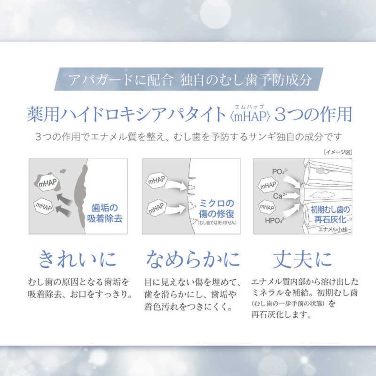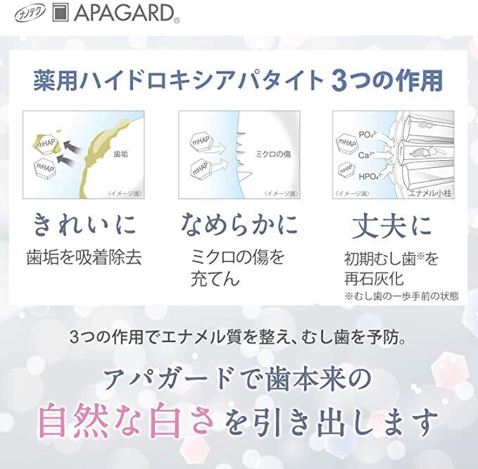 ●歯垢を吸着除去し、歯のエナメル質の目に見えない傷を埋め、ミネラル欠損部(初期むし歯)を再石灰化するナノ<mHAP>の3 つの働きで、むし歯を予防。アパガードは白く美しい歯にします。