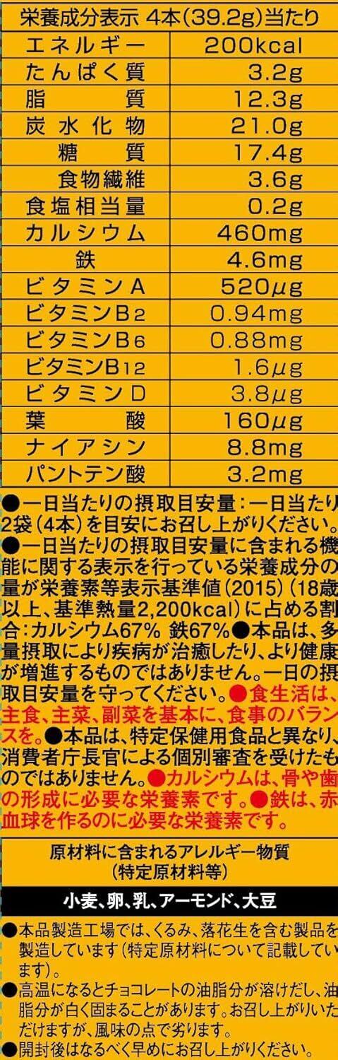 小麦粉(国内製造)、砂糖、ショートニング、マーガリン、アーモンド、小麦全粒粉、ココアパウダー、澱粉、準チョコレート、卵、麦芽糖、難消化性デキストリン、食塩/卵殻Ca、結晶セルロース、乳化剤(大豆由来)、香料(乳由来)、ピロリン酸鉄、ナイアシン、パントテン酸Ca、ビタミンB6、ビタミンB2、ビタミンA、葉酸、着色料(カロチン)、ビタミンB12、ビタミンD