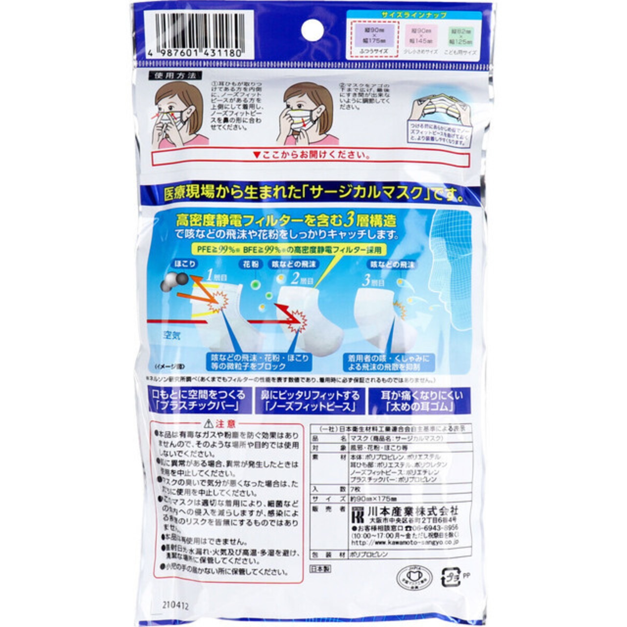 川本産業 感染対策サージカルマスク 7枚入 ★日本製のプリーツタイプサージカルマスク【ふつうサイズ】約9cm × 17.5cm