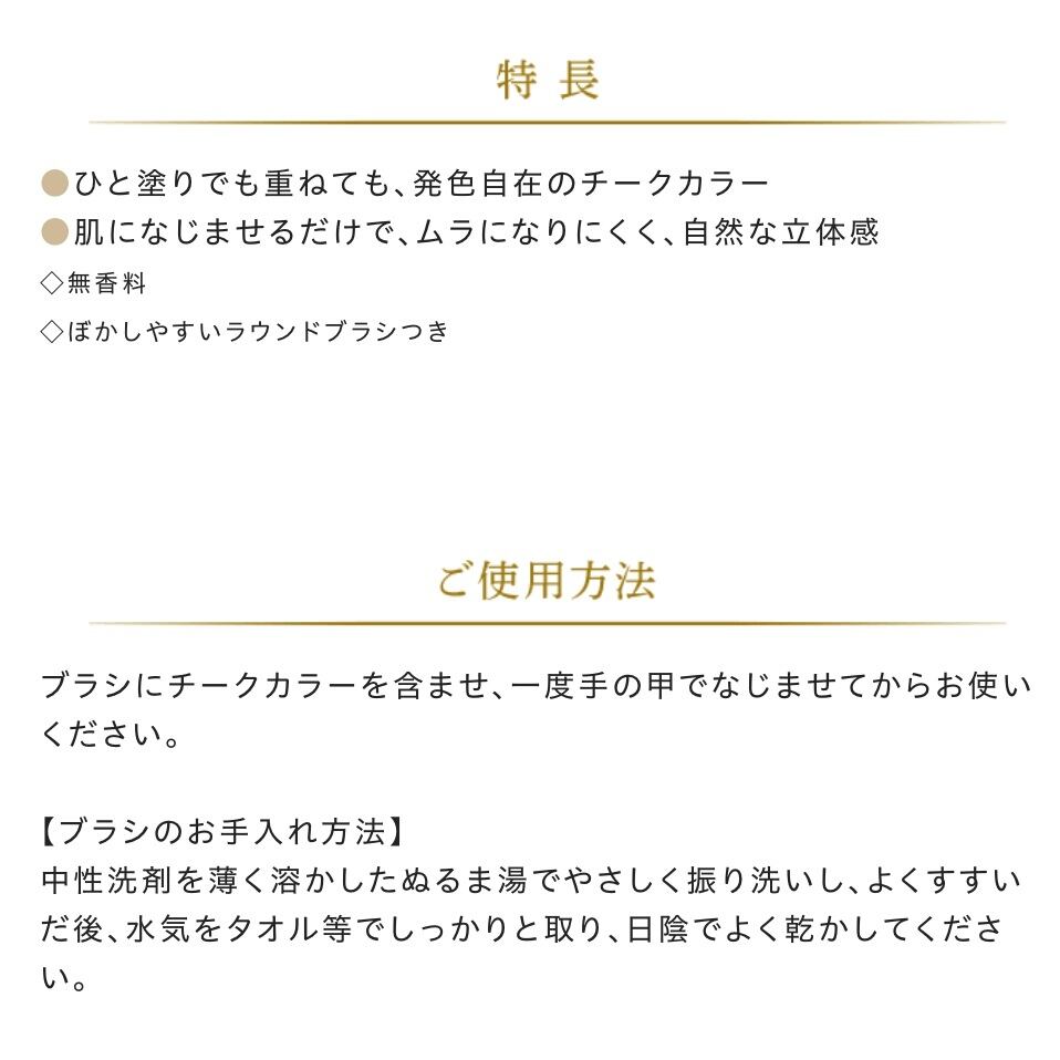 ブラシにチークカラーを含ませ、一度手の甲でなじませてからお使いください。