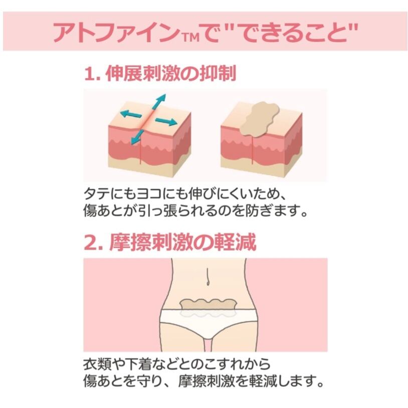 ☑︎伸展刺激・摩擦刺激・紫外線の3つから「傷あと」を守り、「肥厚性瘢痕」や「ケロイド」を予防できるテープです。