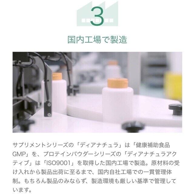 ディアナチュラは国内で生産。無香料、無着色、保存料無添加。長く愛され信頼されるブランドであり続けること。ずっと続けられる、「品質」と「安全性」に厳しくこだわり続けたいから、自社及びグループ研究所による開発と、国内自社工場での一貫管理体制をとっております。世代を超えて続けられるサプリメントを、アサヒから皆さまへ。