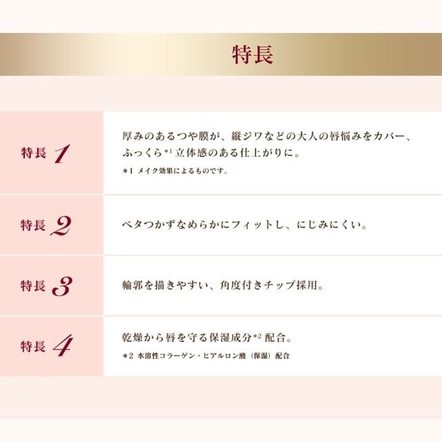 ●厚みのあるつや膜と鮮やかな発色で、50代からの唇をふっくらイキイキと見せます。