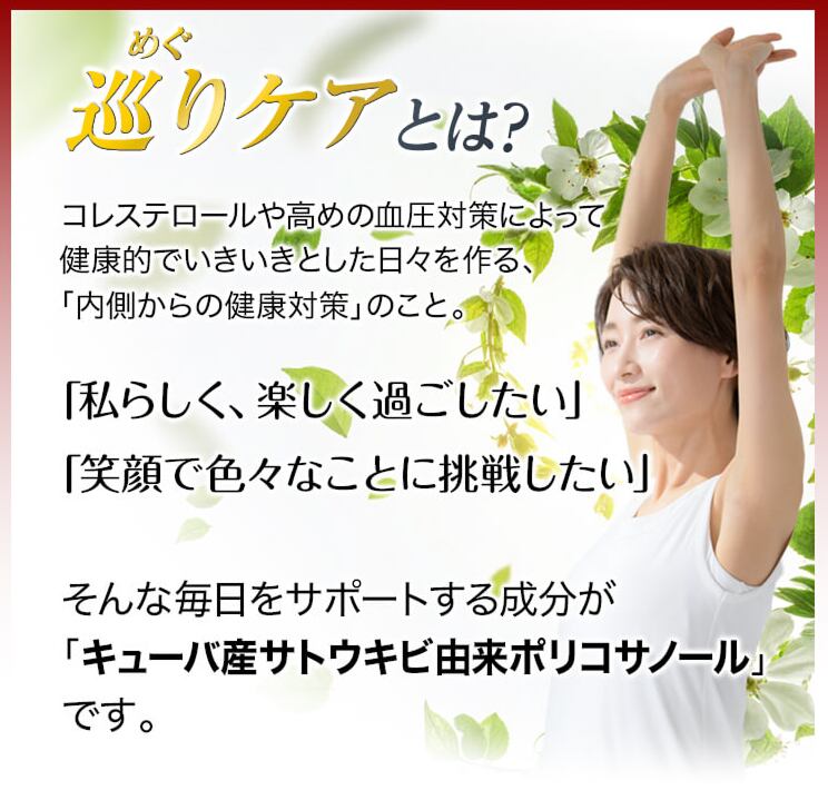 本品には、キューバ産サトウキビ由来ポリコサノールが含まれます。キューバ産サトウキビ由来ポリコサノールは、血中総コレステロールやLDL(悪玉)コレステロールを低下させ、LDL(悪玉)コレステロールとHDL(善玉)コレステロール値の比率を改善することが報告されています。また、血圧が高めの方の血圧を下げる機能が報告されています。