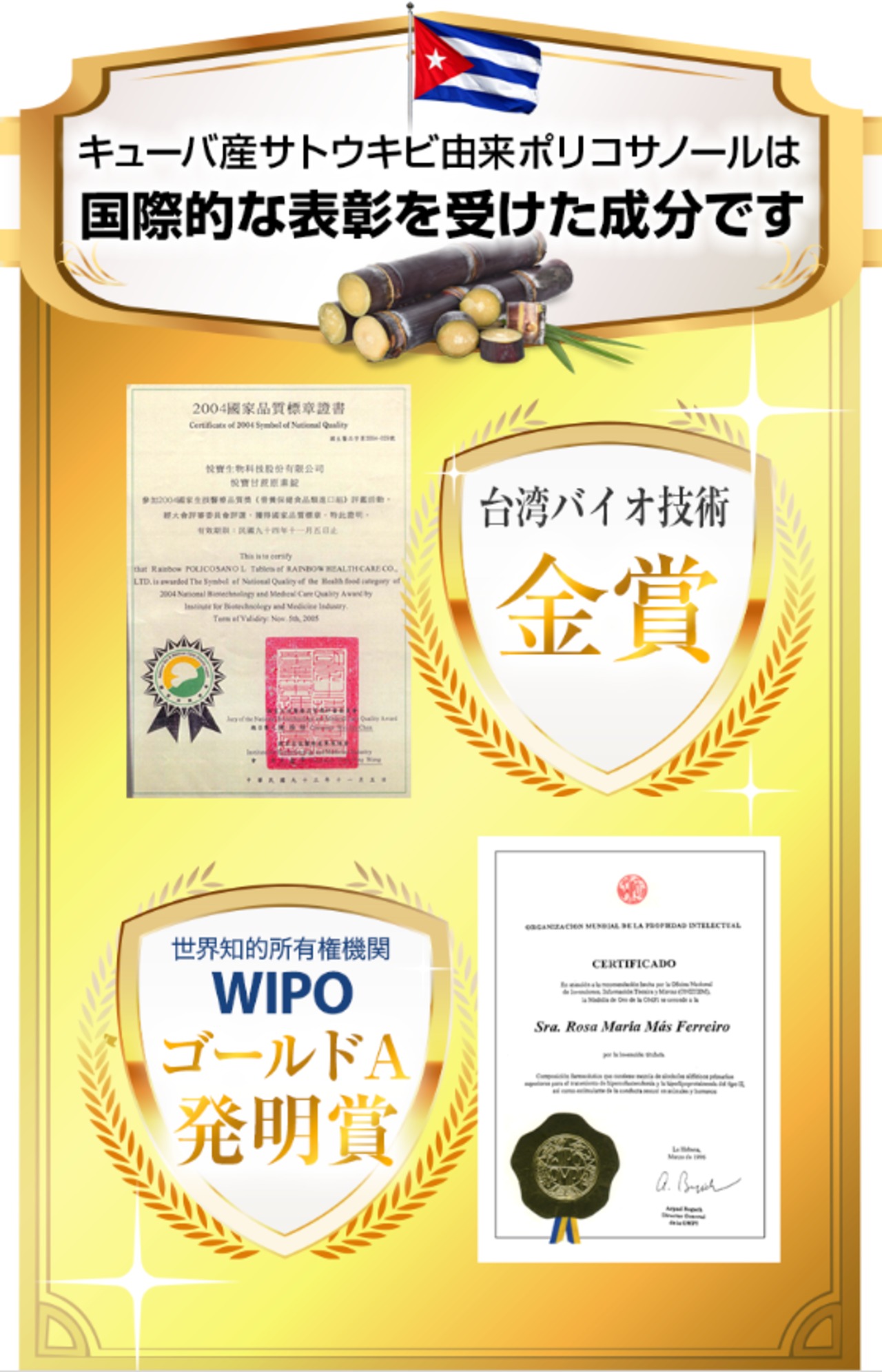 1つの成分で4つの機能が報告されているキューバ産サトウキビ由来ポリコサノール配合。